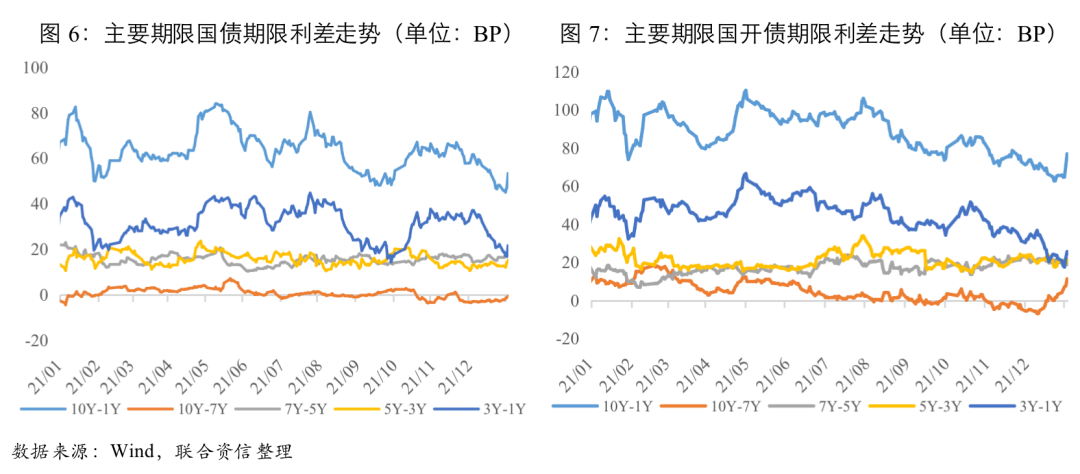 利率债收益率曲线趋于平坦化。2021年利率债短端收益率下行幅度不及长端收益率下行幅度,10Y-1Y期限利差震荡下行,利率债收益率曲线趋平。特别是下半年以来,受实体经济融资需求不足、经济下行压力加大及短端资金利率下行幅度有限等因素影响,利率债收益率曲线平坦化趋势较为明显。从各主要期限利差走势特点看,利率债收益率曲线走平主要是由于3Y-1Y期限利差收窄所致,这在一定程度上反映出市场对短期经济下行压力的担忧有所加深。此外,2021年下半年以来,10年期和7年期国债收益率、国开债收益率均出现“倒挂”,反映出市场对经济在中长期表现的担忧。