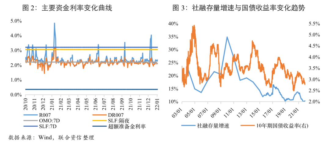 2021年以来,央行贯彻执行稳健的货币政策灵活精准、合理适度,通过灵活开展公开市场操作,熨平市场资金波动,市场资金波动幅度较过去3年降低。具体看,上半年在货币政策边际偏紧的情况下,资金利率略高于上年,但低于疫情前水平;下半年7月份降准,资金利率未出现明显下降,但由于2020年下半年资金利率随着货币政策的边际收紧而上行,2021年资金利率低于上年水平,与7月下旬短端国债收益率低于过去3年同期水平相一致。社融增速与10年期国债收益相关性较大,主要是由于社融一定程度反映了实体融资需求,实体融资需求走弱,也意味着经济面临下行压力,所以国债收益率会随着下降。2021年在房地产调控收紧的带动下,社融增速自3月开始回落,11月在政府债券和企业债券融资的带动下有小幅度回升,整体看,社融增速是影响2021年10年期国债收益率走势的重要因素之一。