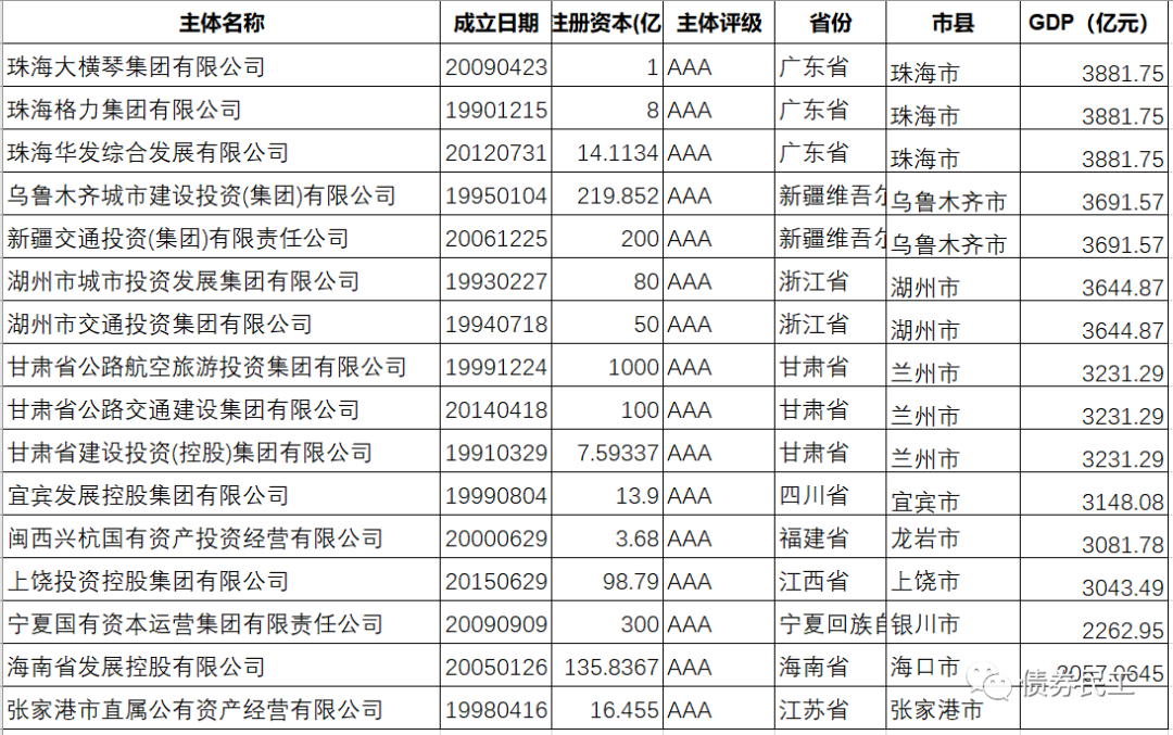 5、AAA城投公司所在区域的GDP情况。扣除掉直辖市和副省级城市,苏州市是全国AAA城投公司GDP数据最高的地级市;吉林市是AAA城投公司GDP数据最低的地级市。目前共有16家城投公司所在区域的GDP低于4000亿元。