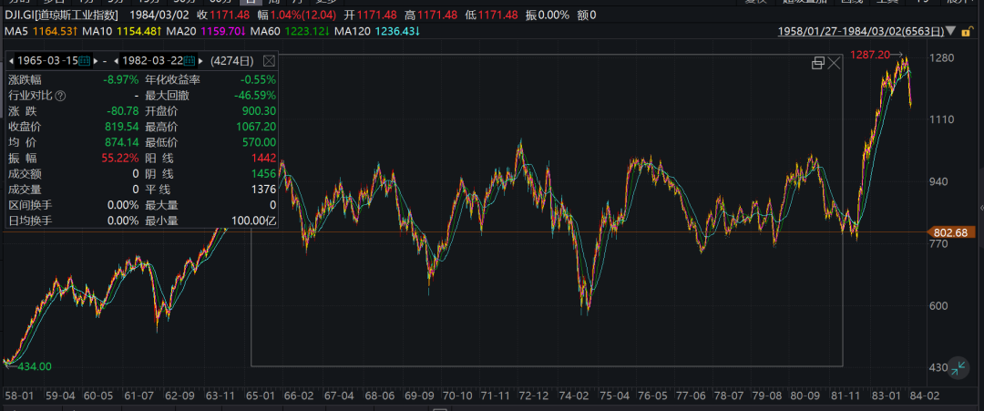 从1965年3月到1982年3月,道琼斯工业指数17年原地踏步,如果定投道琼斯指数,那么17年下来还是负收益。