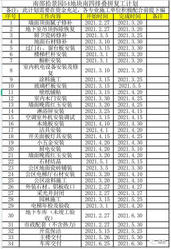有的项目,在今年1月就有非常具体的复工方案。比如北京拾景园二期。方案详细到墙面、石材修补等等细节。各位且看 ▼