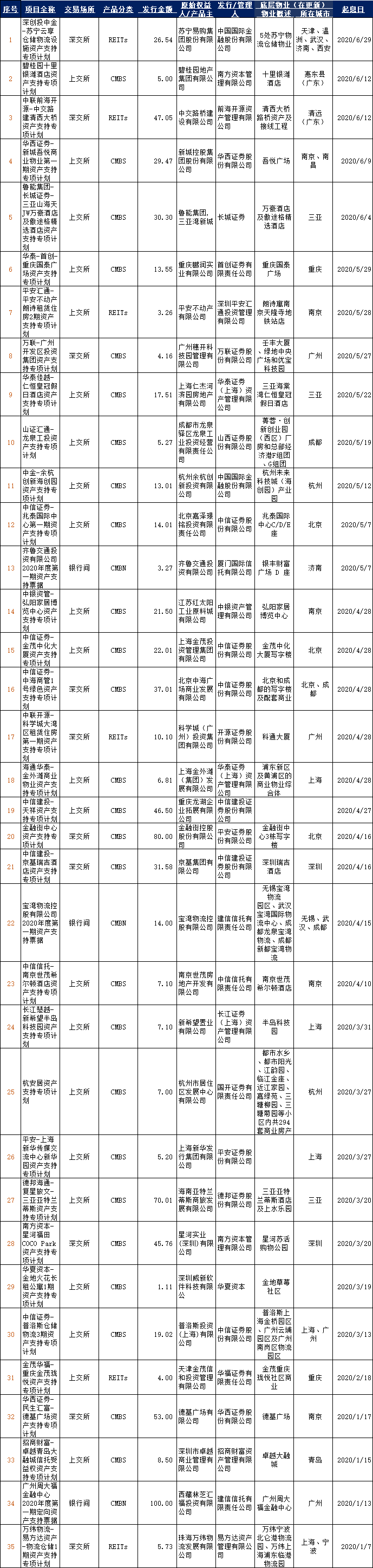 2020年1月1日至2020年6月30日,国内已发行CMBS(含CMBN、下同)/类REITs产品35单,总规模815.44亿元(不含储架规模),其中类REITs产品6只、CMBS产品29只(含CMBN3只)。其中以购物中心/商场为底层资产的CMBS/类REITs产品25只。标的物业分布以上海/北京居多及其他强二线城市为主。