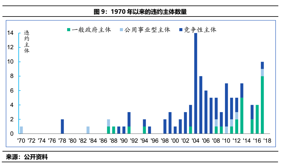 从违约的品种来看,在2010年之前,市政债违约主体以竞争性主体为主,但进入2010年之后,一般政府主体数量开始激增,竞争性主体数量开始下滑。