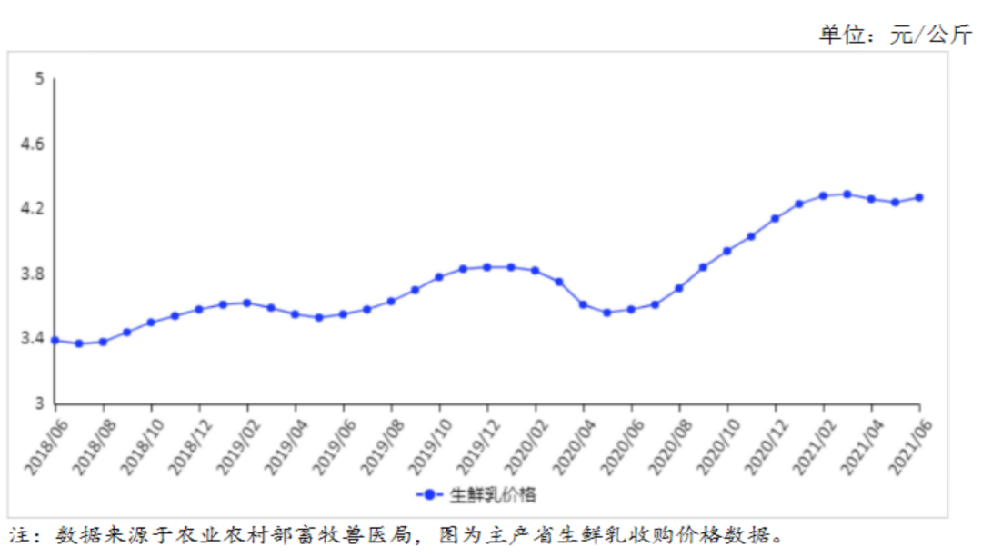 在乳制品行业中,原奶价格始终是成本大头。原奶主要指的是生鲜乳,也是白奶、酸奶等液态奶的主要原料。下图是近三年来生鲜乳价格走势图,可以看出,价格自18年6月以来产品价格一直处于震荡攀升状态。尤其是自去年年中以后,价格明显步入加速上升状态。