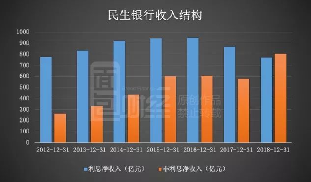 年报显示,民生银行的利息净收入为766.8亿元,较上年同期下滑了11.41%;非利息净收入达800.89亿元,较上年同期增长了38.73%。
