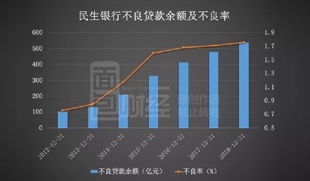 年报显示,截至2018年底,民生银行的不良贷款余额为538.66亿元,较上年同期增加了59.77亿元,增幅为12.48%。不良率为1.76%,较上年末上升0.05个百分点。
