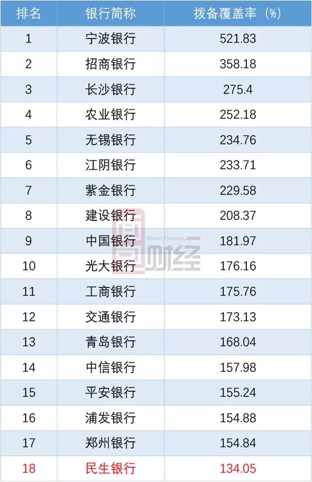 从目前已发布年报的18家上市银行来看,民生银行的拨备覆盖率最低: