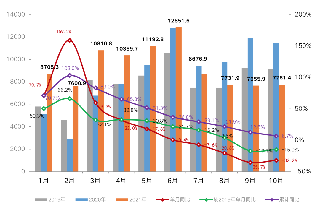 2021年10月,典型城市商品住宅成交热度延续低位波动,整体市场压力较大,传统房地产旺季“金九银十”失约,百强房企单月业绩表现也不乐观,10月,百强房企实现销售操盘金额7761.4亿元,受下半年市场明显降温的影响,10月单月业绩同比去年同期延续了自7月以来的下跌趋势。