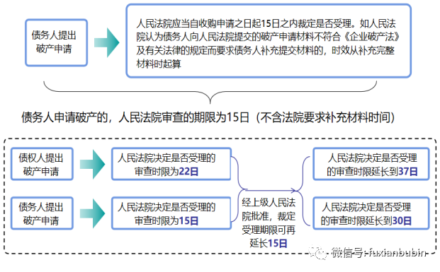 另外如遇到特殊情况,经上级人民法院批准,人民法院裁定受理的期限可延长到15日,即如果是债权人申请破产,人民法院审查的最长期限为37日,如是债务人,负有清算责任人的申请批次,人民发运审查的最长期限为30日。