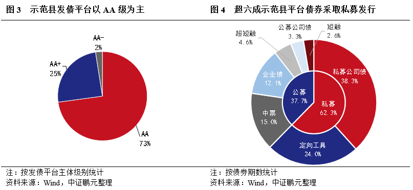 2.超七成示范县发债平台主体级别为AA级,超六成示范县平台债券采取私募发行