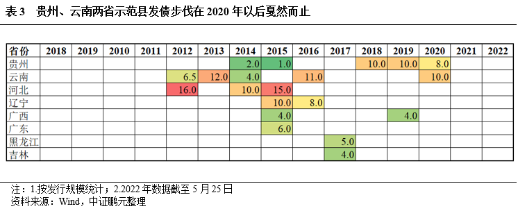 2.贵州、云南两省,尽管地区经济亦偏弱,但因前期地方经济发展战略吸引到了全国的金融资源,示范县前期发债步伐明显快速挺进,但在2020年之后戛然而止,与地区债务率偏高、近两年风险暴露有关;河北、辽宁、广西、广东、黑龙江、吉林六省近三年也未有示范县平台发债。