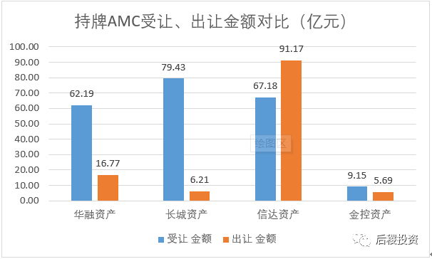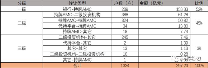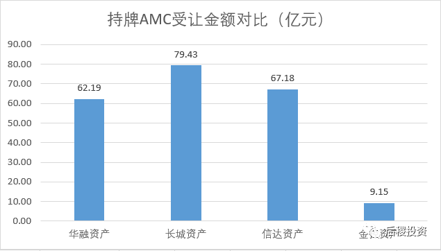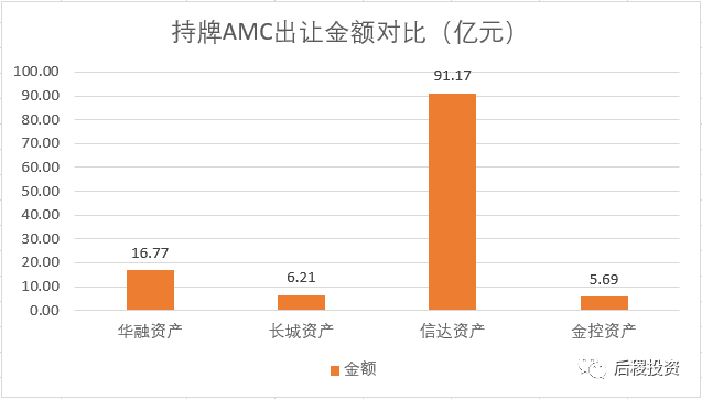 持牌AMC出让类型包括了转给二级投资机构、其它、持牌AMC这3种,合计成交金额119.84亿。