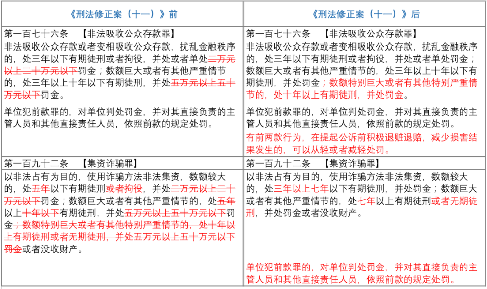 《刑修(十一)》对于非法吸收公众存款罪在原先的基础上,增加了“数额特别巨大”一档量刑标准,并将该档法定刑规定为“十年以上有期徒刑,并处罚金”。对于集资诈骗罪则在原有的基础上删去了“数额特别巨大”一档的量刑标准,并将“数额较大”的法定刑由原先的“五年以下或者拘役”修改为“三年以上七年以下有期徒刑”,“数额巨大”法定刑由原先的法定刑幅度提升至“七年以上有期徒刑或者无期徒刑,并处罚金或者没收财产”。