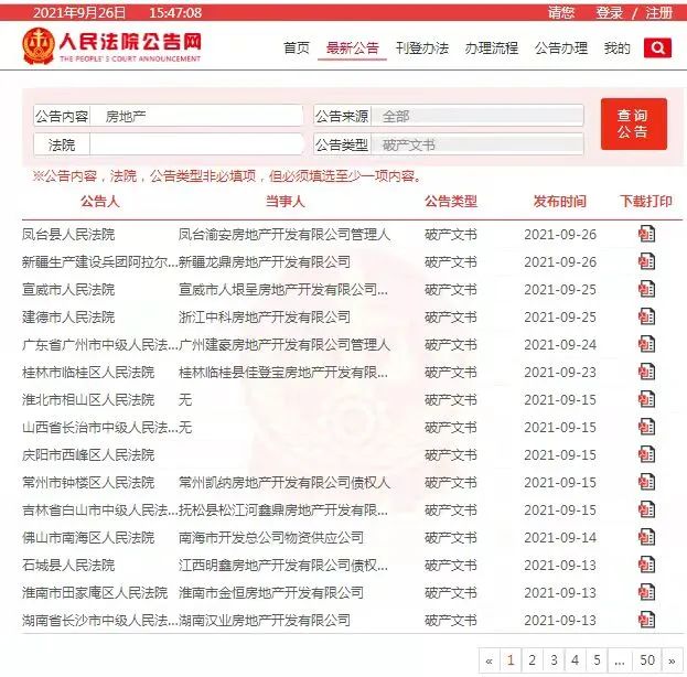 我很不情愿的去翻看了下人民法院公告网,9月26日,2021年走到了第270天,虽然光耀集团还「榜上无名」,没有在该网站上公示,但却能看到和光耀集团一样倒下的房企们,已经达到了300家。