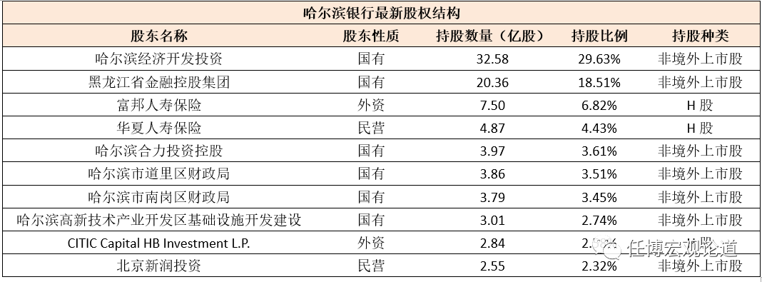 2019年以来其股权结构亦发生较大变化。2019年11月15日哈尔滨银行发布公告,明确哈尔滨经济开发投资及黑龙江金融控股集团分别受让哈尔滨银行黑龙江科软、黑龙江同达、鑫永胜、天地源远、拓凯及巨邦部分股东持有的哈尔滨银行股权。同年12月12日,黑龙江银保监批复同意黑龙江省金融控股集团和哈尔滨经济开发投资分别受让哈尔滨银行股权,受让后持股比例分别为18.51%和29.63%。不过,目前哈尔滨银行的股权结构中,仍有两家明天系保险公司,即富邦人寿(6.82%)和华夏人寿(4.43%)。