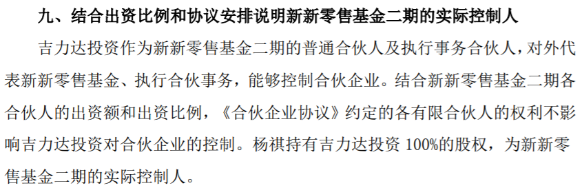 所以新新零售基金二期的控制人为海南吉力达,自然人杨祺持有海南吉力达100%股权,因此,杨祺为新新零售基金二期的实际控制人。