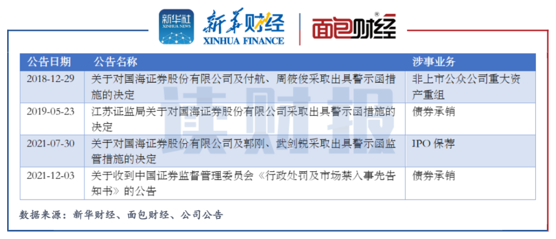 比如,2021年12月份,因担任胜通集团公司债券“16胜通01”“16胜通03”“17胜通01”的主承销商而涉事虚假记载、未尽职调查等,公司被没收违法所得1798万元,并处以60万元罚款。