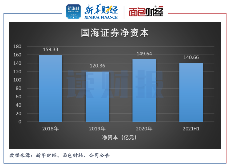 国海证券持续的再融资也没有能够有效的提升净资本水平。2021年上半年末,国海证券的净资本为140.66亿元,较上年年末减少8.98亿元,较2018年末减少18.67亿元。净资本是券商的核心监管指标,净资本下降将有可能导致券商业务受限。