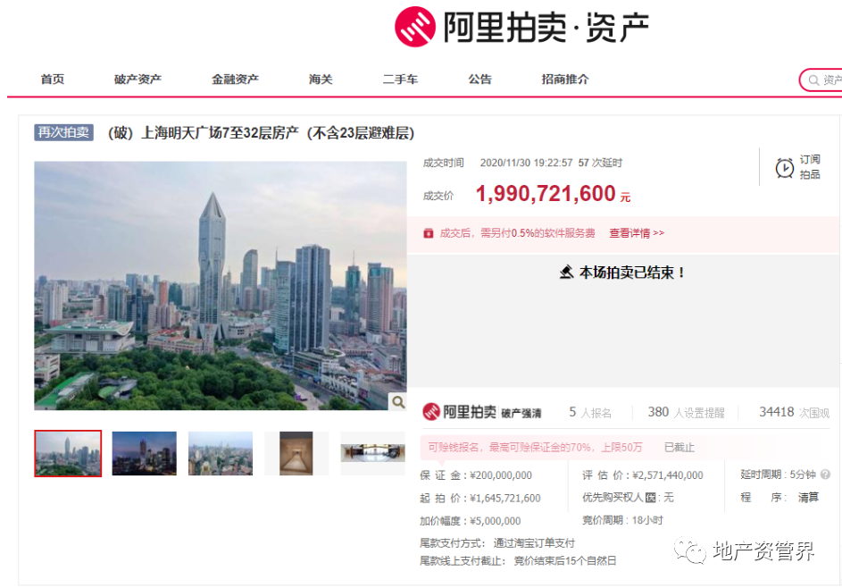 11月30日,第三次入市拍卖的上海明天广场7至23层资产终于拍卖成功,成交拍卖价19.9亿元。