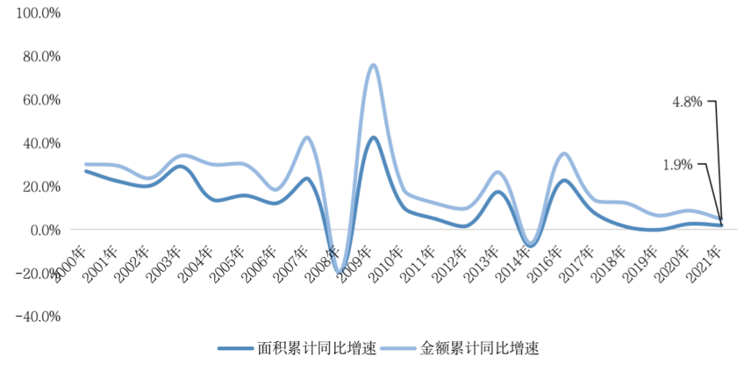 2021年房地产市场整体呈现前高后低的特征,上半年,城市住房需求尤其是改善型住房需求稳步释放,但下半年新开工、土地购置和开发投资均降至冰点,“以价换量”和信贷宽松对年末市场“翘尾”起到一定的积极作用。