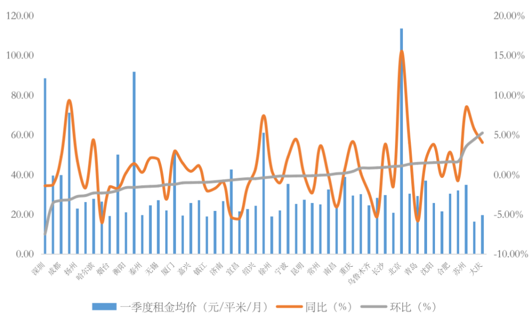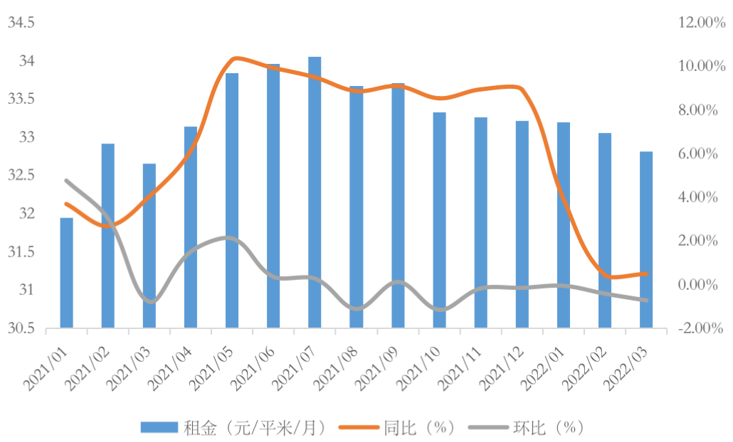 值得注意的是,一季度租金已呈连续下跌趋势,自2021年10月租金已连续6个月下跌。